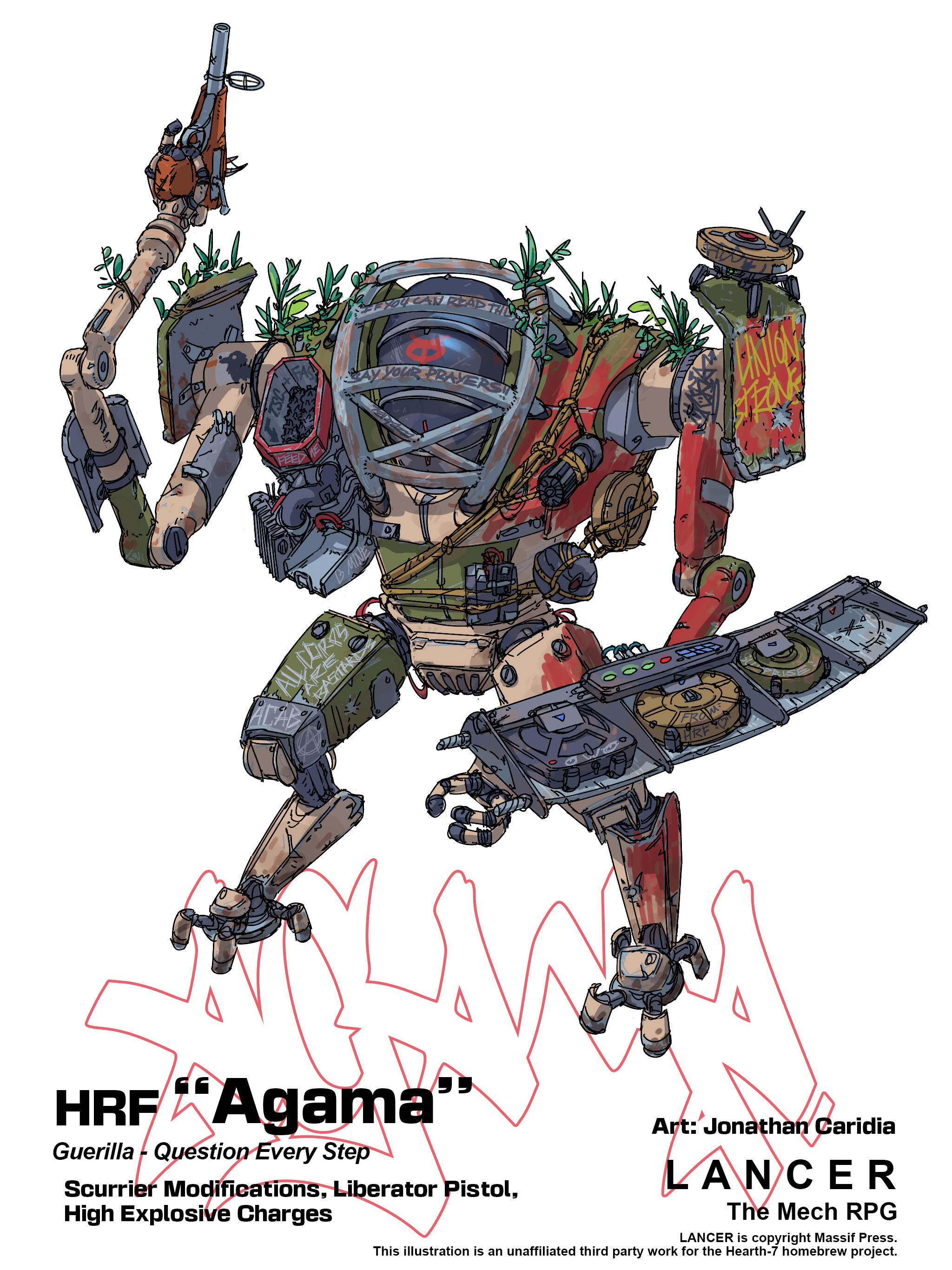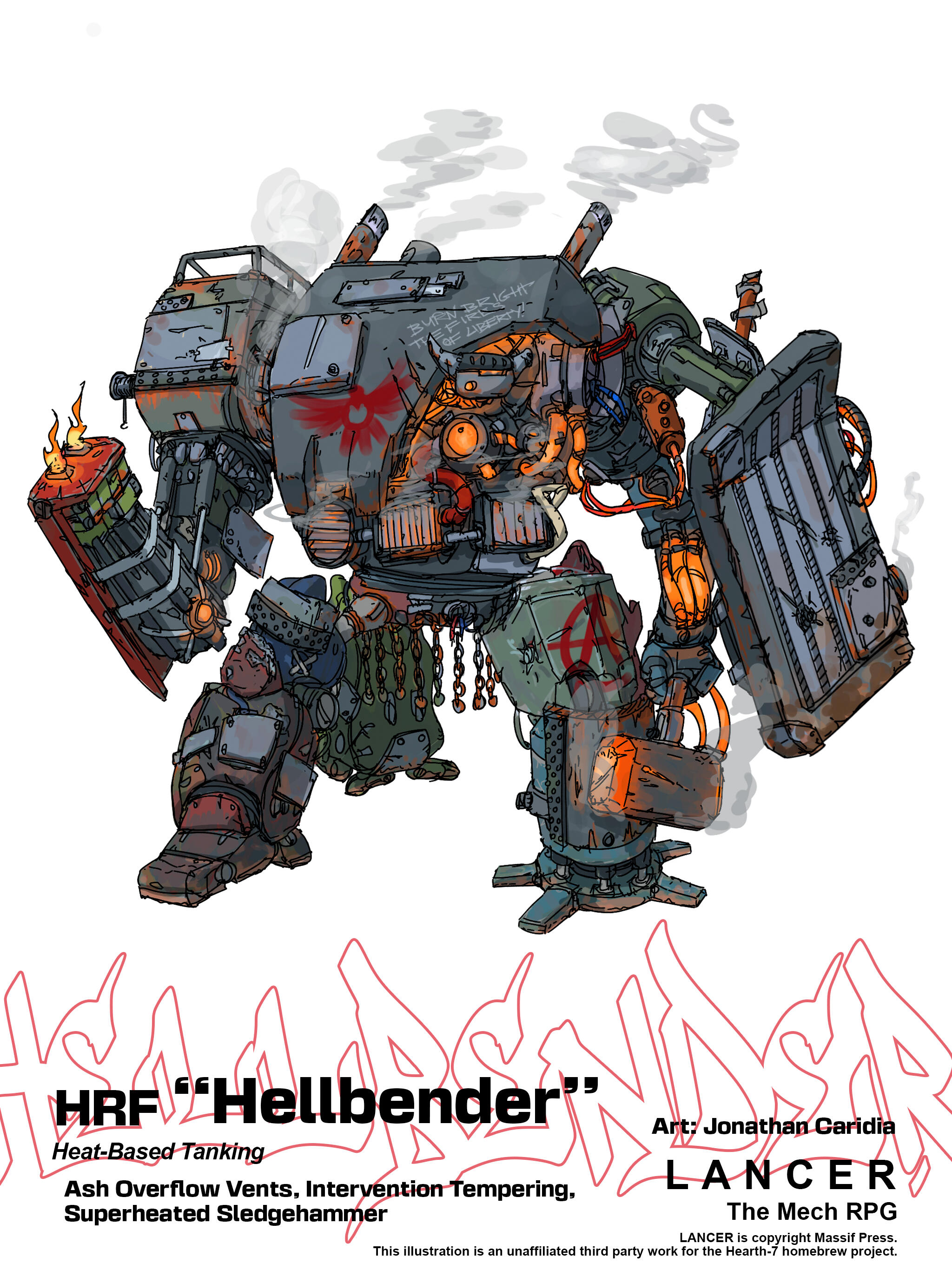 A series of illustrations for a LANCER tabletop RPG homebrew project. A group of rebels trying to overthrow their abusive corporate overlords, the Hearth Revolutionary Forces are characterised by scrapiness in the face of low resources, repurposing and retrofitting old mining mechs, stolen enemy frames or whatever they could cobble together from space parts. This is reflected in their patched up, dinged and scratched, mismatching design language.